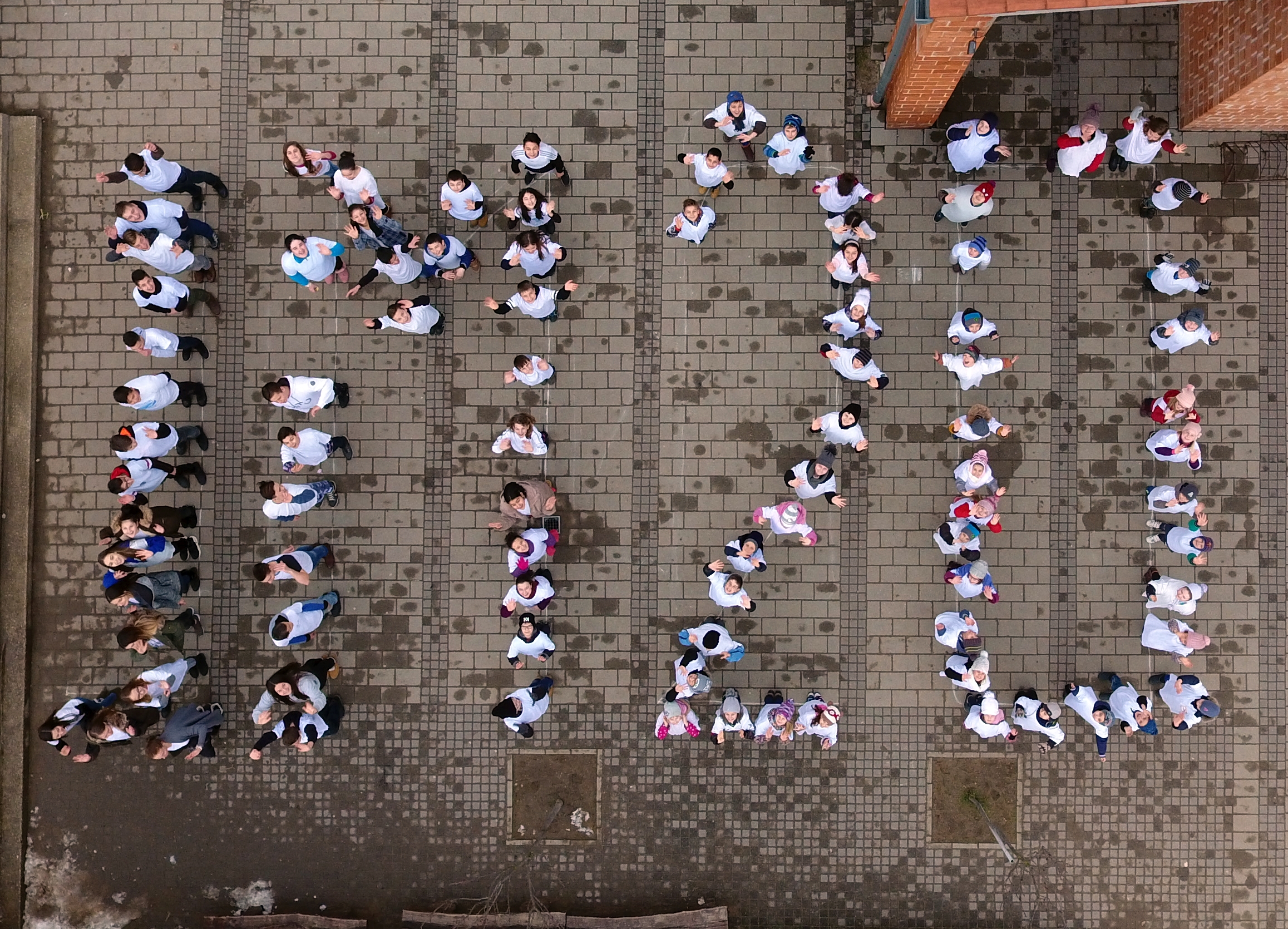 Az előkészületekben a 8. osztályos tanulóink voltak segítségemre. Garas Fanni, Horváth Melissza, Gálos Lukács, Kocsis Zsolt, Neubaer Fanni Sántik Vivi és Pék Martin többször is rajzolgatta a formációt, mivel egy nem várt délelőtti hóesés elmosta addigi munkájukat. Délutánra azonban kedvezően alakult az időjárás, és el tudtuk készíteni a felvételeket.